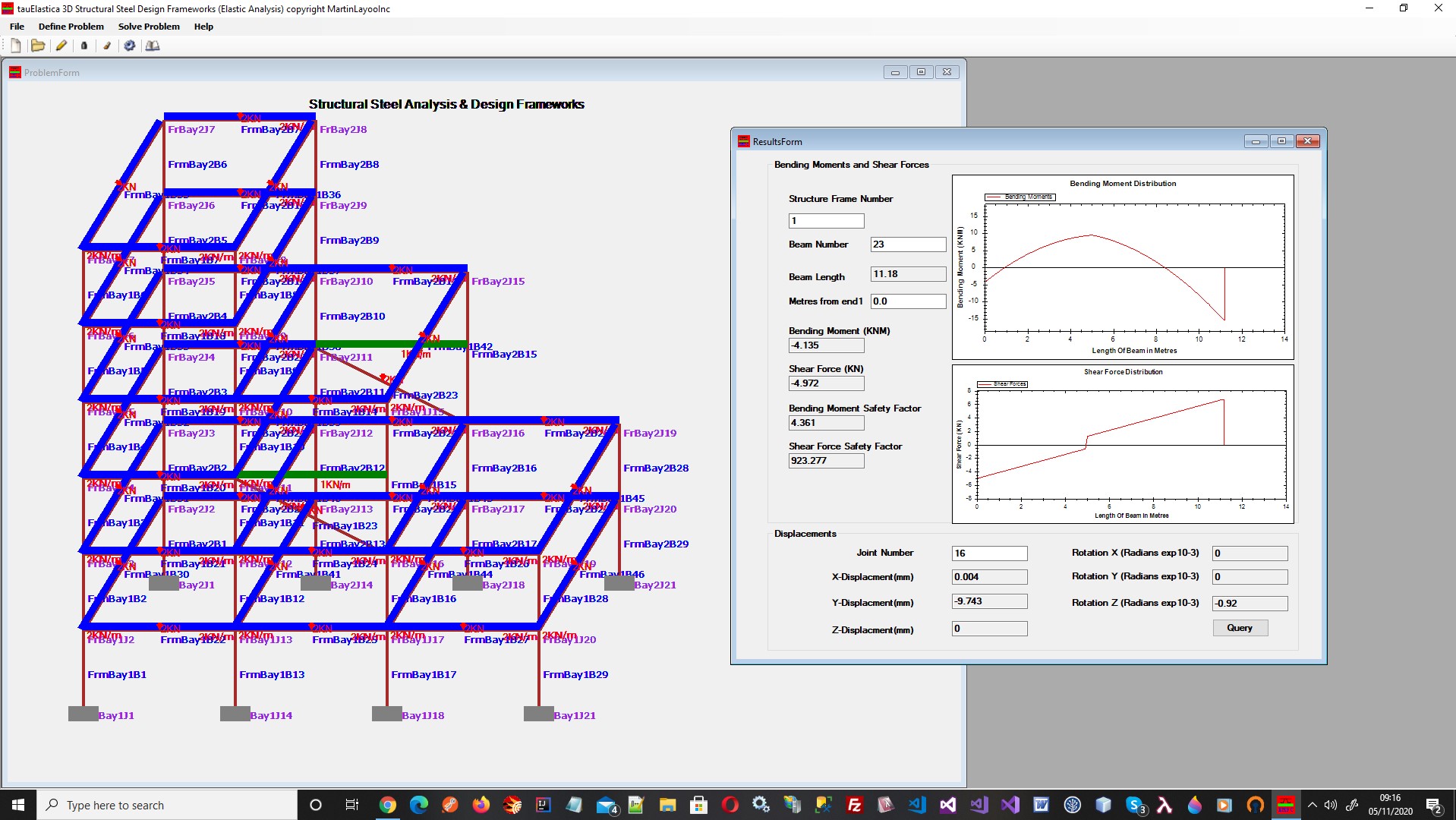 The features include Database integration (a bespoke module will be later developed to take into account Database storage of Structural Steel Properties for reuse). Printing Facilities, have been incorporated, and so have minute detailed Bending Moment Distributions, Shear Force Distributions, Displacements and Rotations in 3D Space of the individual Steel Members on Solution of a given defined Problem. Of course naturally Saving of work is done easily and incorporated too.